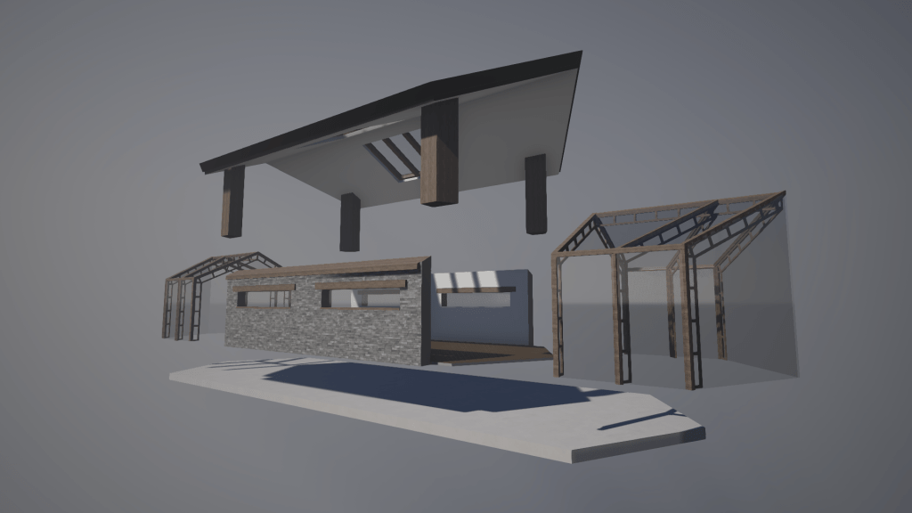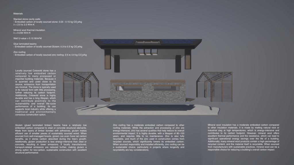 Such choices regarding materiality were made as a result of environmental, thematical and aesthetical reasons. The stone utilised can be locally sourced, decreasing embodied carbon and environmental cost. Additionally, the stone increases the solid, permanent feel of the construction of the home. This is reinforced by the glulam beams which ‘lock’ the stone in place. Such a quantity of glass was used to maximise the natural lighting within the house.