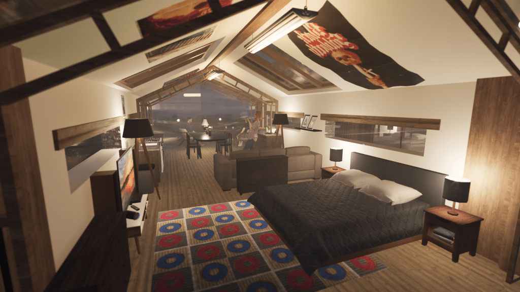 The building’s unorthodox shape helps to eliminate acoustic anomalies, such as echo and feedback. The hexagonal shape of the room redirects the sound away from the source until it fully dissipates. Despite its open-plan design, the space is designed to be fully decorated with household items, include sofas, tables, a bed and a fully stocked kitchen, further helping to decrease and absorb sound anomalies.
